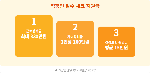 직장인은 근로장려금(연 최대 330만 원), 자녀장려금(자녀 1인당 최대 100만 원), 건강보험 환급금(평균 15만 원)을 확인해야 합니다. 근로장려금은 단독가구 기준 연소득 2,200만 원 이하면 신청 가능하며, 매년 5월 정기 신청 기간을 놓치면 반기 신청도 가능합니다.
