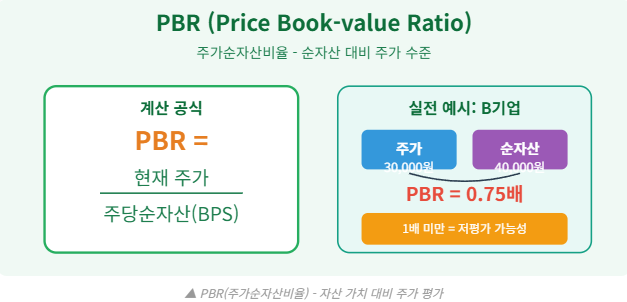 PBR 계산식은 '현재 주가 ÷ 주당순자산(BPS)'입니다. B기업 주가가 30,000원, 주당순자산이 40,000원이라면 PBR은 0.75배입니다. PBR 1배 미만은 기업의 청산 가치보다 주가가 낮다는 의미로 이론상 저평가입니다. 하지만 실제로는 PBR 0.5배 이하 기업들도 많으며, 이는 시장이 해당 기업의 미래 가치를 낮게 평가한다는 신호일 수 있습니다. PBR은 특히 제조업, 금융업처럼 유형자산이 많은 업종에서 유용합니다. 반대로 IT, 서비스업처럼 무형자산 비중이 높은 업종은 PBR이 5~10배여도 정상일 수 있습니다. PER PBR 뜻 조건을 이해할 때는 재무제표상 순자산의 질도 함께 확인해야 합니다.