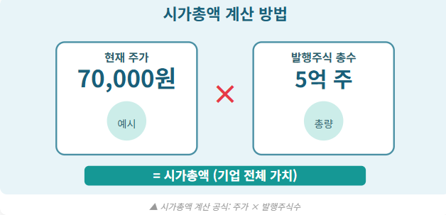 시가총액이란 조건을 파악할 때는 단순히 주가 숫자가 아니라 '주가×발행주식수'로 계산된 전체 기업 가치를 봐야 합니다. 주가가 낮다고 저평가된 것이 아니며, 주가가 높다고 고평가된 것도 아닙니다.