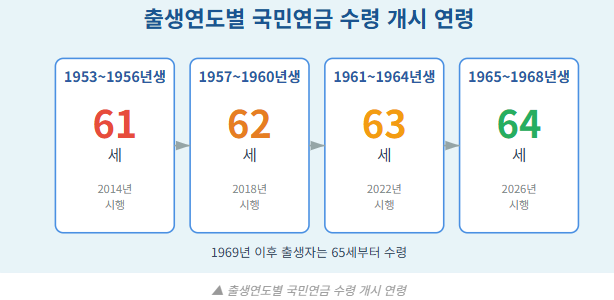 국민연금 수령나이는 1953년생부터 단계적으로 상향 조정되고 있습니다. 2026년 기준 출생연도별 수령 개시 나이는 다음과 같습니다.