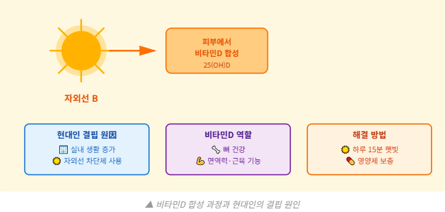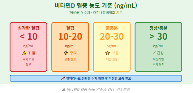 · 결핍: 10~20ng/mL — 면역력 저하, 만성피로