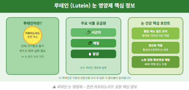 루테인은 카로티노이드 계열의 천연 색소 성분으로, 인체 스스로 합성할 수 없어 반드시 음식이나 영양제로 섭취해야 합니다. 주로 시금치·케일·달걀노른자에 함유되어 있으며, 눈의 황반과 수정체에 집중적으로 축적됩니다. 황반은 시력의 중심 역할을 하는 부위로, 이곳이 손상되면 황반변성으로 이어져 시력 저하가 발생할 수 있습니다. 40대 이전부터 미리 루테인을 섭취해야 하는 이유가 바로 여기에 있습니다. 황반 내 루테인 농도는 20~30대부터 서서히 감소하기 때문에, 증상이 나타난 뒤가 아니라 예방 차원에서 조기 보충이 권장됩니다.