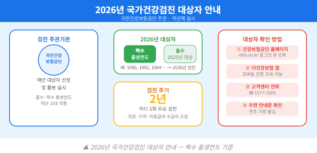 국가건강검진은 국민건강보험공단이 주관하며, 대상자는 출생연도 홀수·짝수 기준으로 격년제로 나뉩니다. 2026년에는 출생연도 끝자리가 짝수인 분(예: 1980년, 1992년생 등)이 일반건강검진 대상자입니다. 홀수 출생연도(예: 1981년, 1993년생)는 2025년이 검진 해였으므로 2026년에는 원칙적으로 대상에서 제외됩니다. 단, 직장가입자 중 비사무직 근로자는 매년 검진 대상이므로 출생연도와 무관하게 2026년에도 받을 수 있습니다. 지역가입자와 피부양자는 세대주 및 만 20세 이상 세대원이 짝수 연도 기준으로 검진을 받습니다. 건강검진 대상자 조회 조건을 정확히 확인하려면 공단 홈페이지나 앱을 이용하는 것이 가장 빠릅니다.